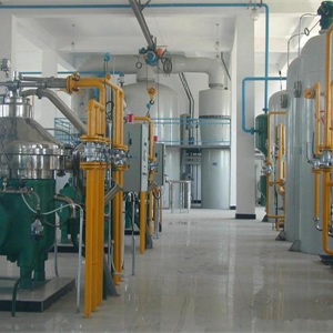 操作條件:過濾毛油含雜不大于0.2%,堿液濃度18~22°Bé,超量堿添加量為理論堿量的10%~25%,有時還先添加油量的0.05%~0.20%的磷酸(濃度為85%),脫皂溫度70~82℃,洗滌溫度95℃左右,軟水添加量為油量的10%~20%。連續(xù)真空干燥脫水,溫度90~95℃,操作絕對壓力為 2.5~ 4.0 kPa。吸附脫色溫度為105~100℃,操作絕對壓力為 2.5~ 4.0 kPa,脫色溫度下的操作時間為30 min左右,活性白土添加量為油量的 1%~4%。利用立式葉片過濾機分離白土?xí)r的過濾溫度不低于100℃。脫色油中P≤5 ppm、Fe≤0.1ppm、Cu≤0.01ppm。脫臭溫度240~260℃左右,操作絕對壓力260~650Pa,汽提蒸汽通入量油量的0.5%~2%,脫臭時間 40~120min,檸檬酸(濃度 5%)添加量為油量的0.02%~0.04%,安全過濾溫度不高于70℃。
